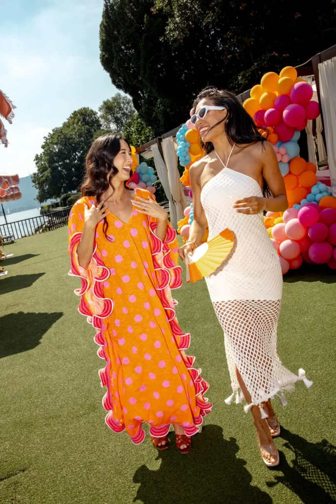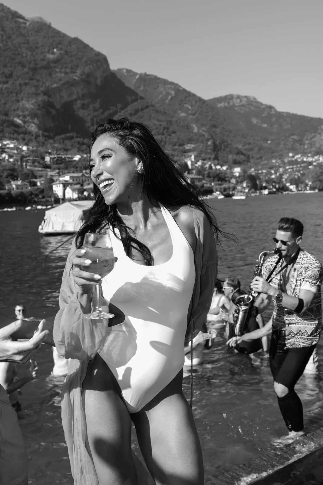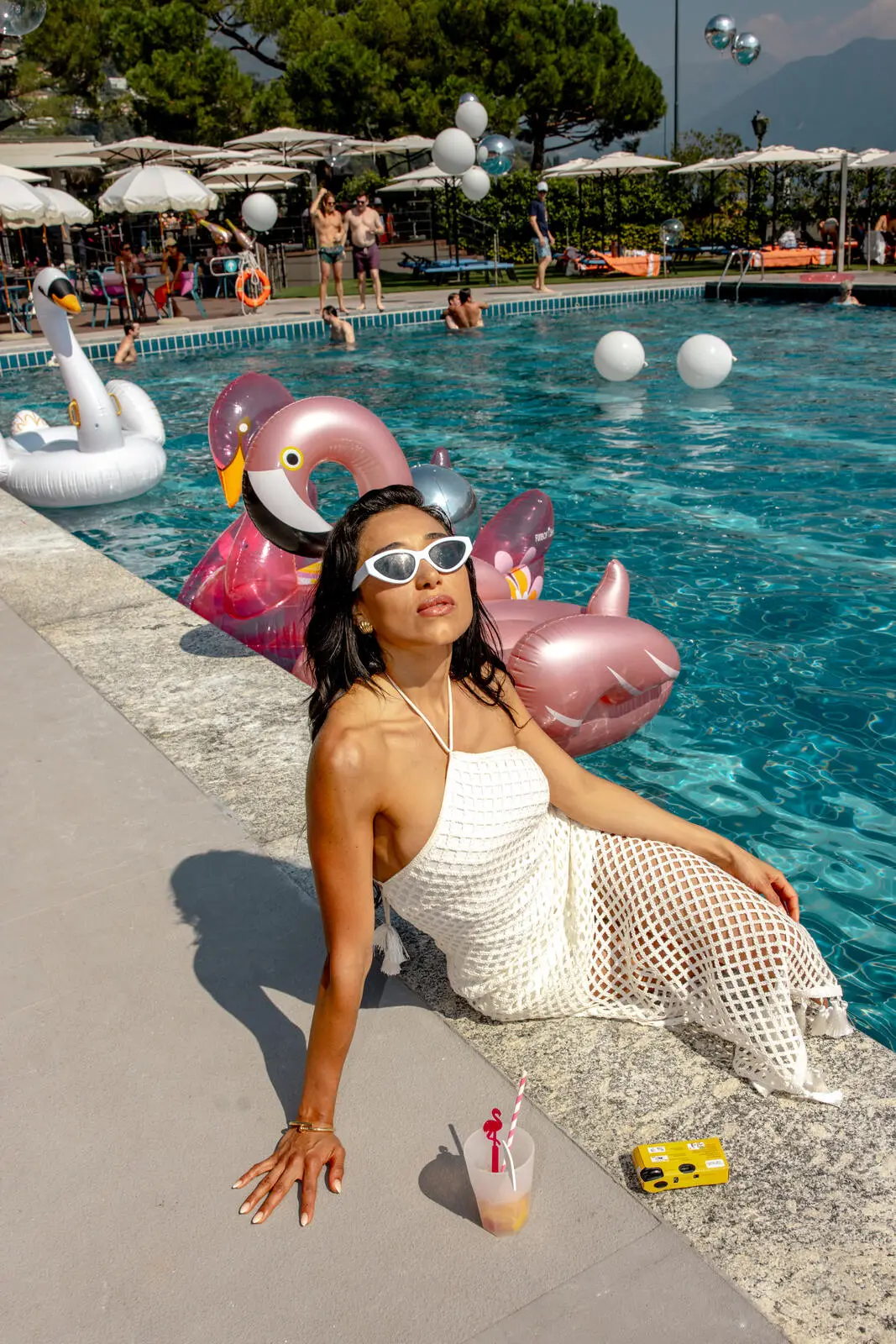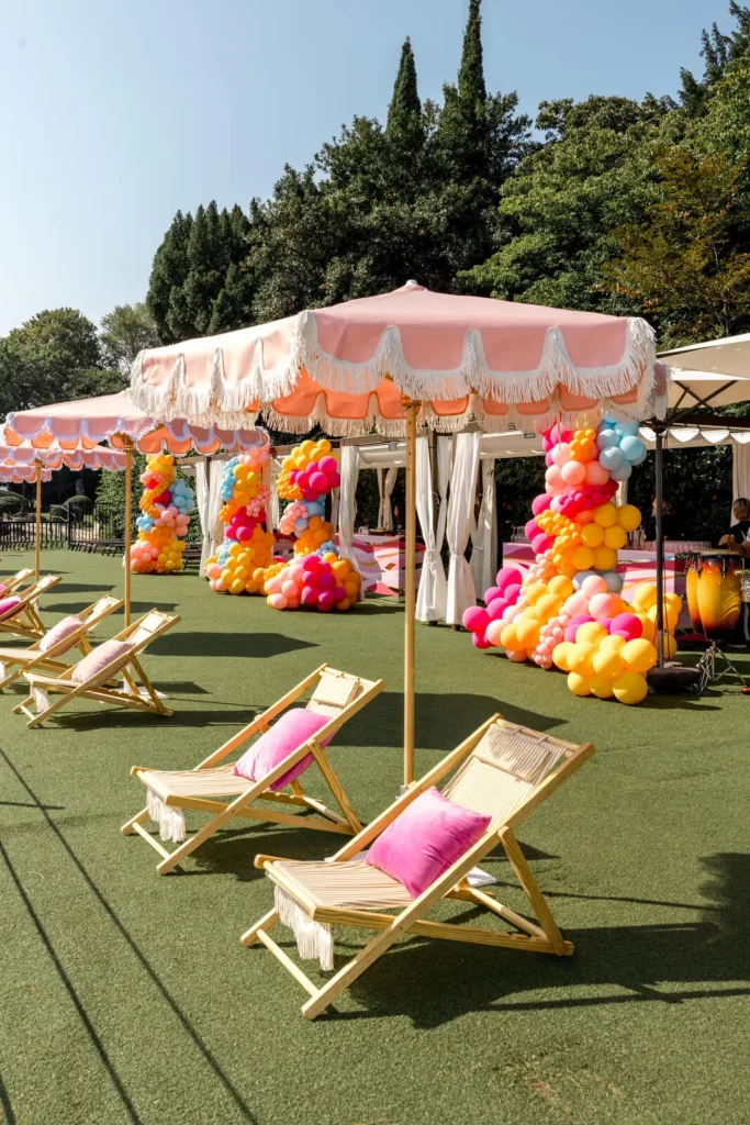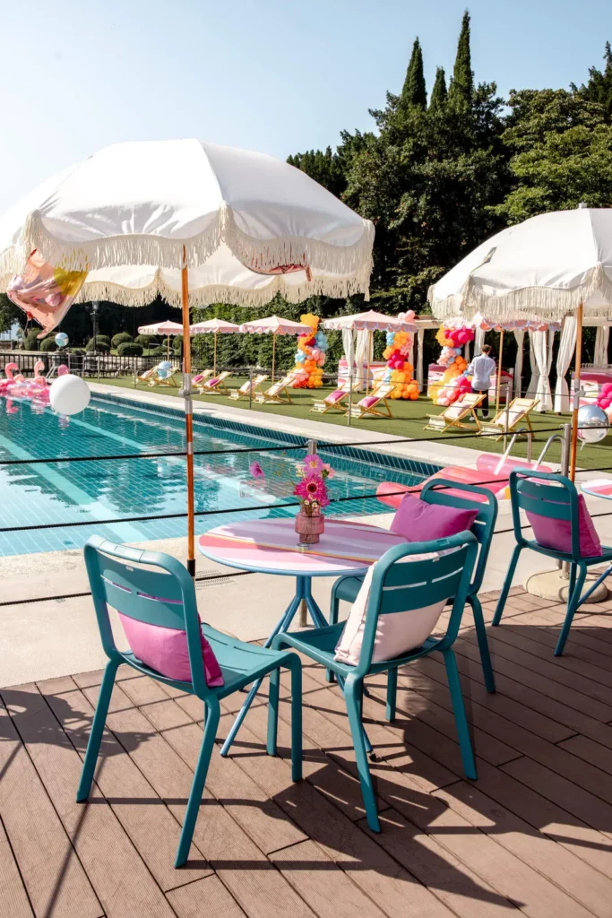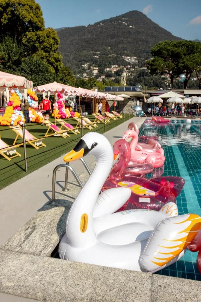 The farewell event was a vibrant pool party at Lido di Cernobbio’s private pool overlooking the lake. A Barbie-style colored theme with bright pinks and hot colors, silver mirror disco balls, inflatables in the pool, giant balloon installations, and an open bar created a colorful and lively atmosphere.