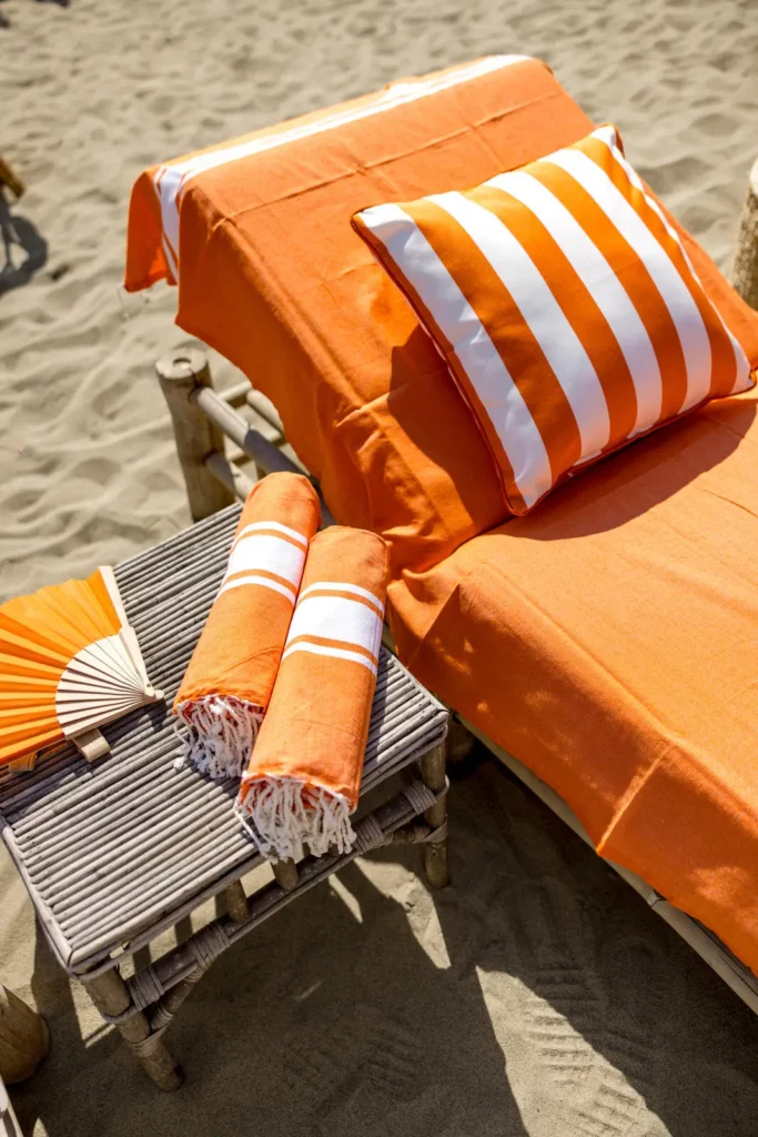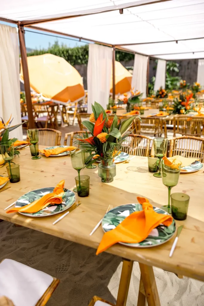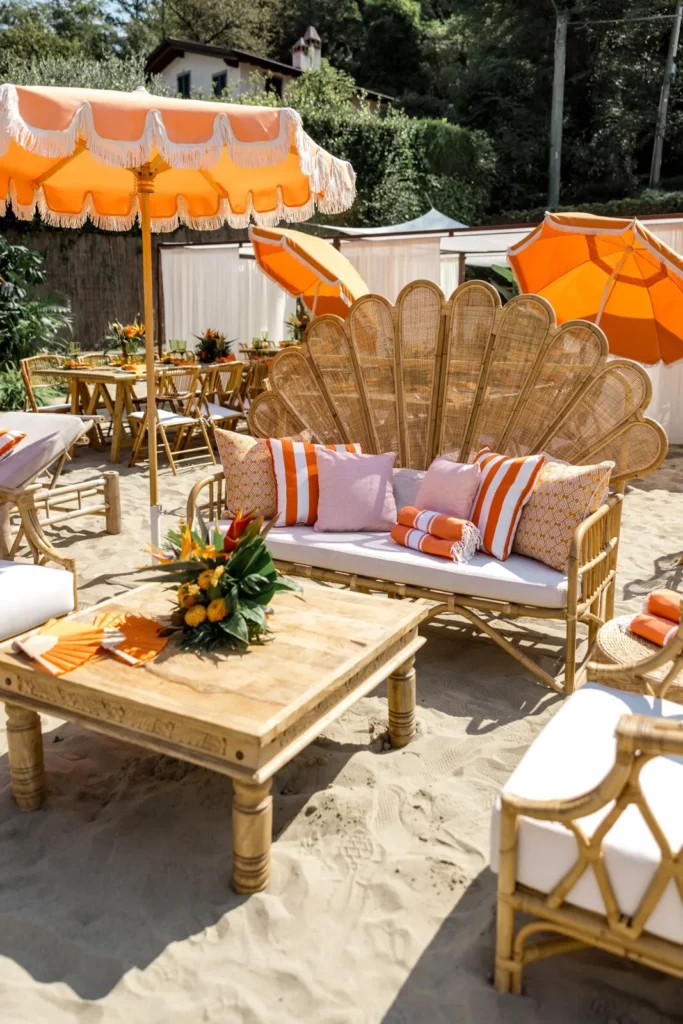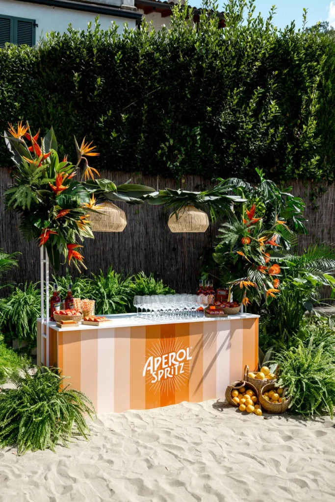 The setting included boho-style bamboo lounge furniture, king-size sun beds, wooden tables and chairs, white gazebos, and tropical plants, all accented with the iconic orange color of Spritz. There was also a custom-made photo booth corner, orange fans, beach towels, embroidered caps, spritz-flavored Italian candy, and even spritz-flavored gelato.