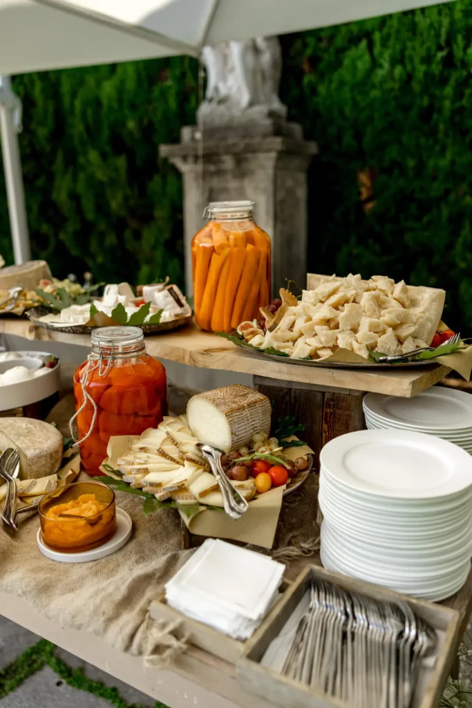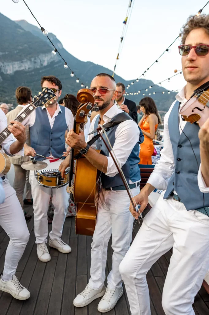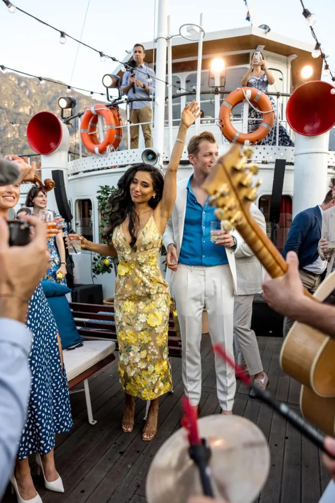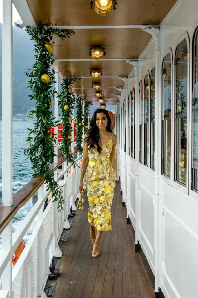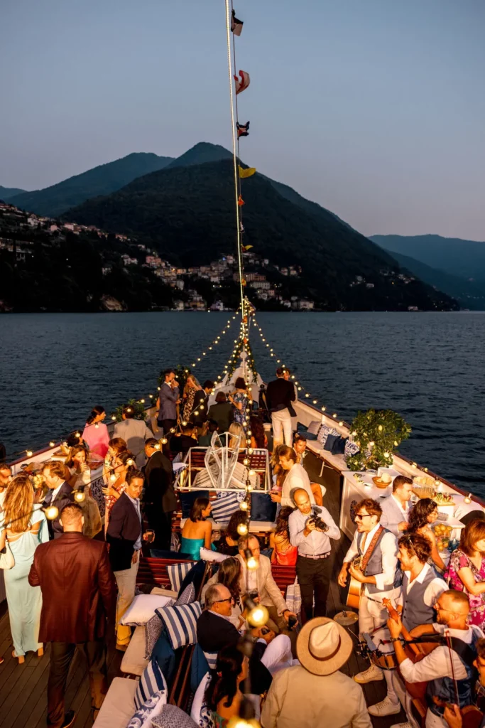 The celebrations began with an unforgettable cruise across Lake Como during sunset on an original vintage ferry. Departing from the iconic waterfront Piazza in Cernobbio, the ship was equipped with custom-made food and drink stations on the deck, an indoor open bar, custom cushions and tablecloths in traditional blue and white maiolica prints, and lemon trees for a true Mediterranean welcome. An engaging Italian roaming band and a limoncello bar got guests dancing until – and even after – the ship’s return to port.