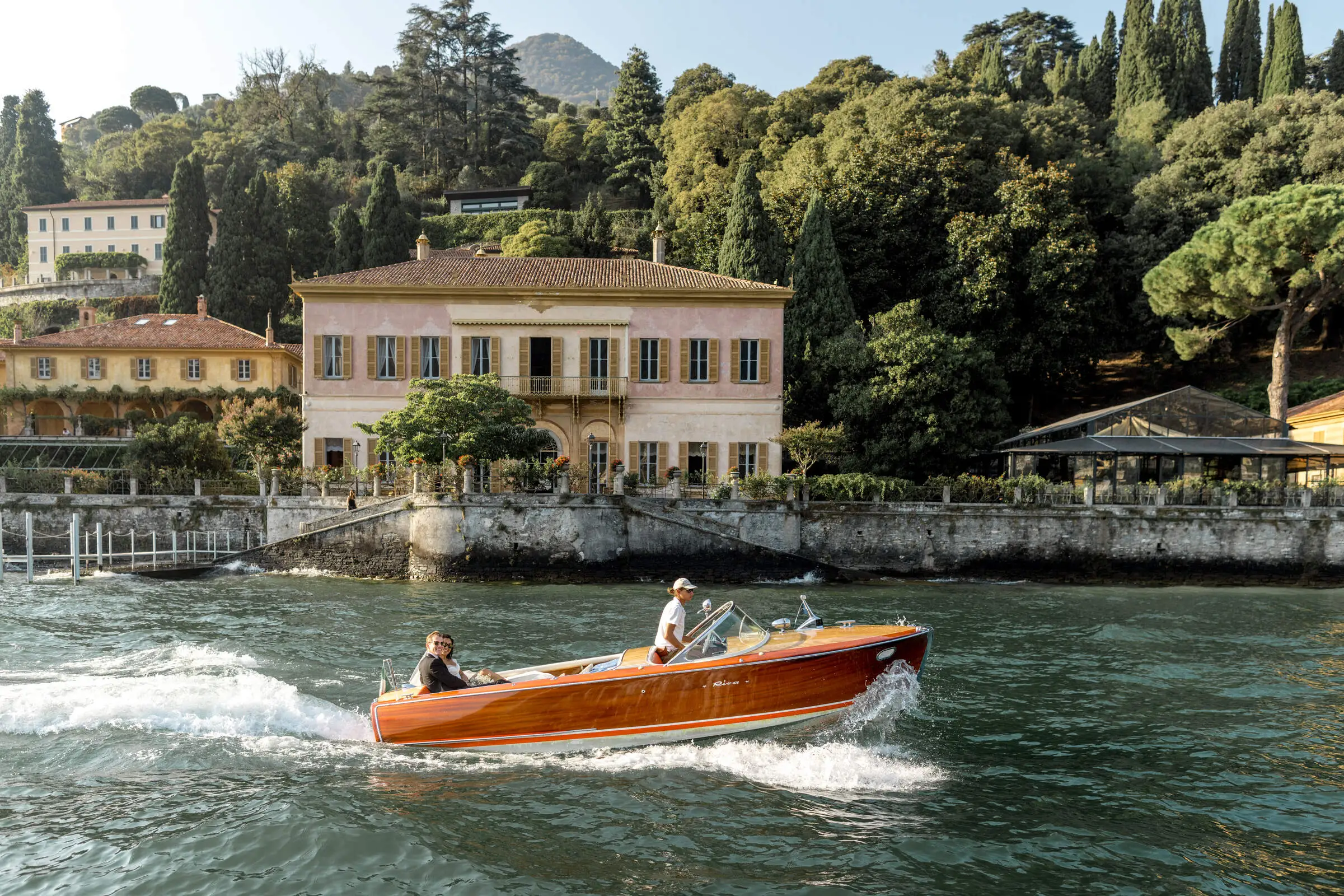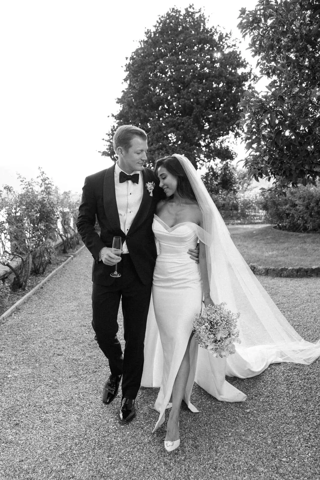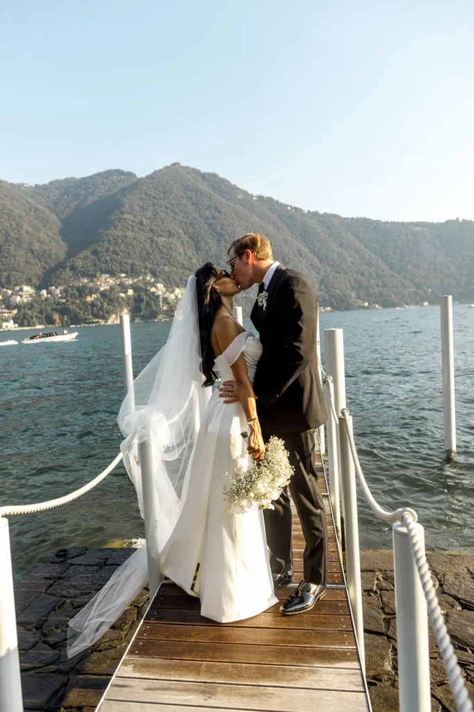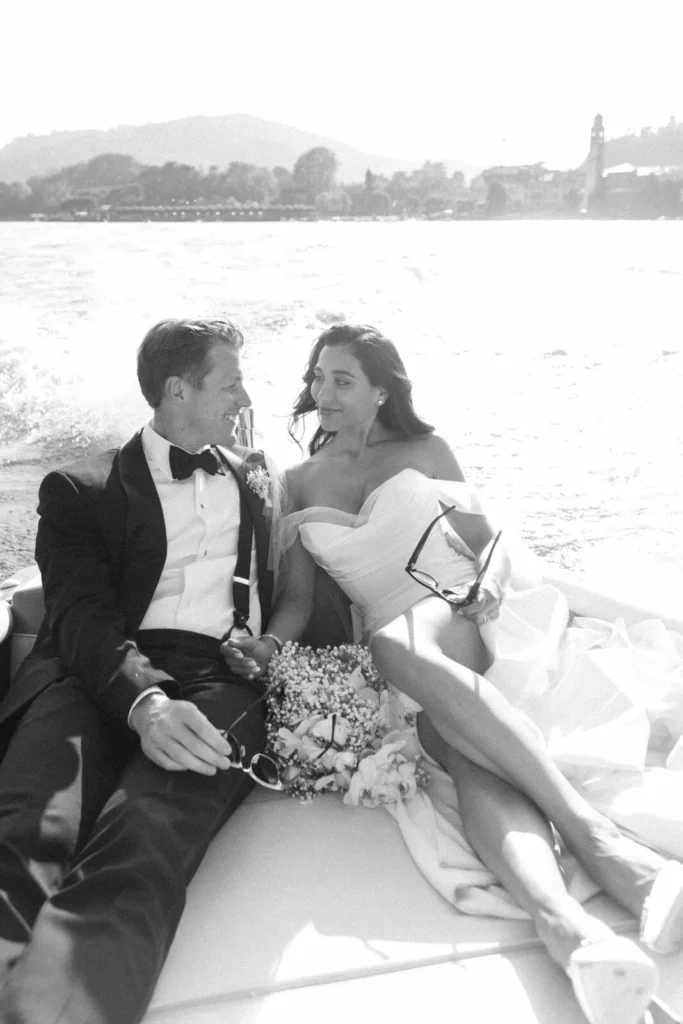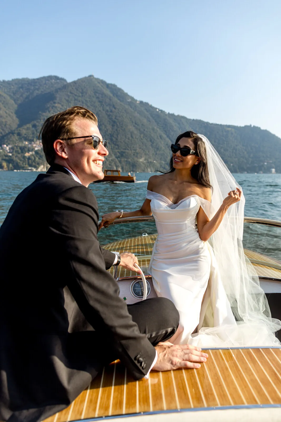 During their private moment alone, Stephanie and Matthew embraced the enchanting beauty of Lake Como aboard a classic boat. The sun reflecting off the tranquil waters and the picturesque landscape in the background set a perfect scene.