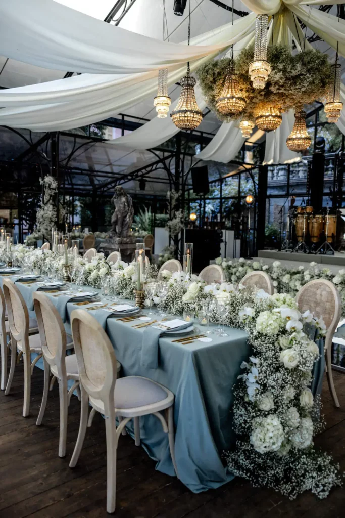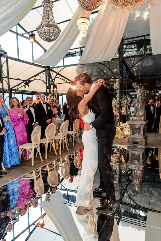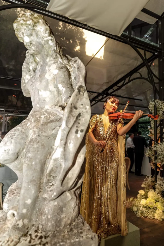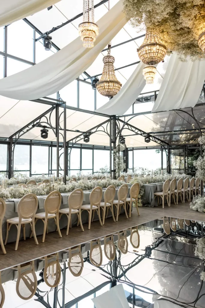 The wedding reception took place in a glass marquee in the villa’s courtyard, combining interiors and exteriors. The exquisitely decorated tent incorporated trees and statues, with green and white colors and touches of gold on the table settings, creating a curated and romantic garden-style reception.
