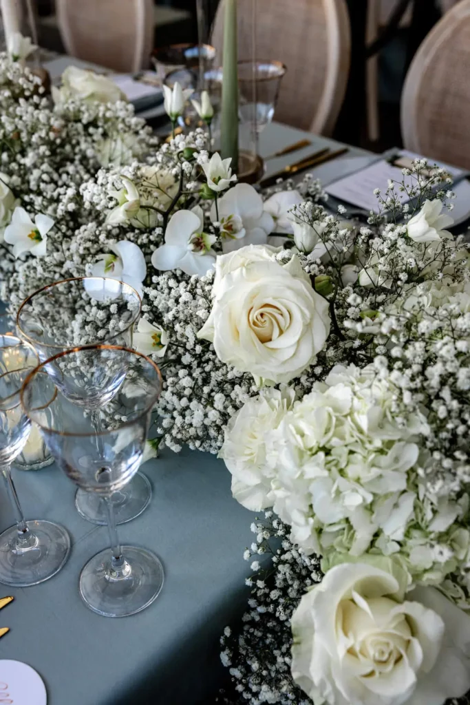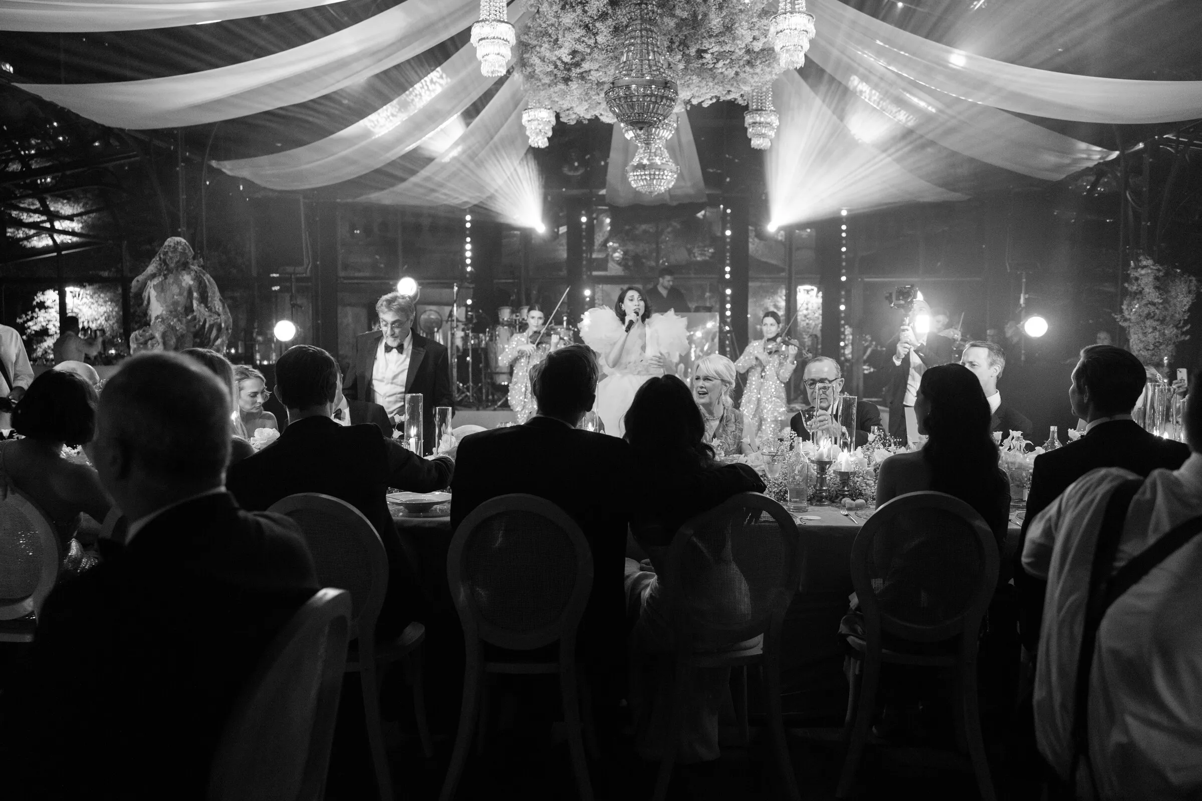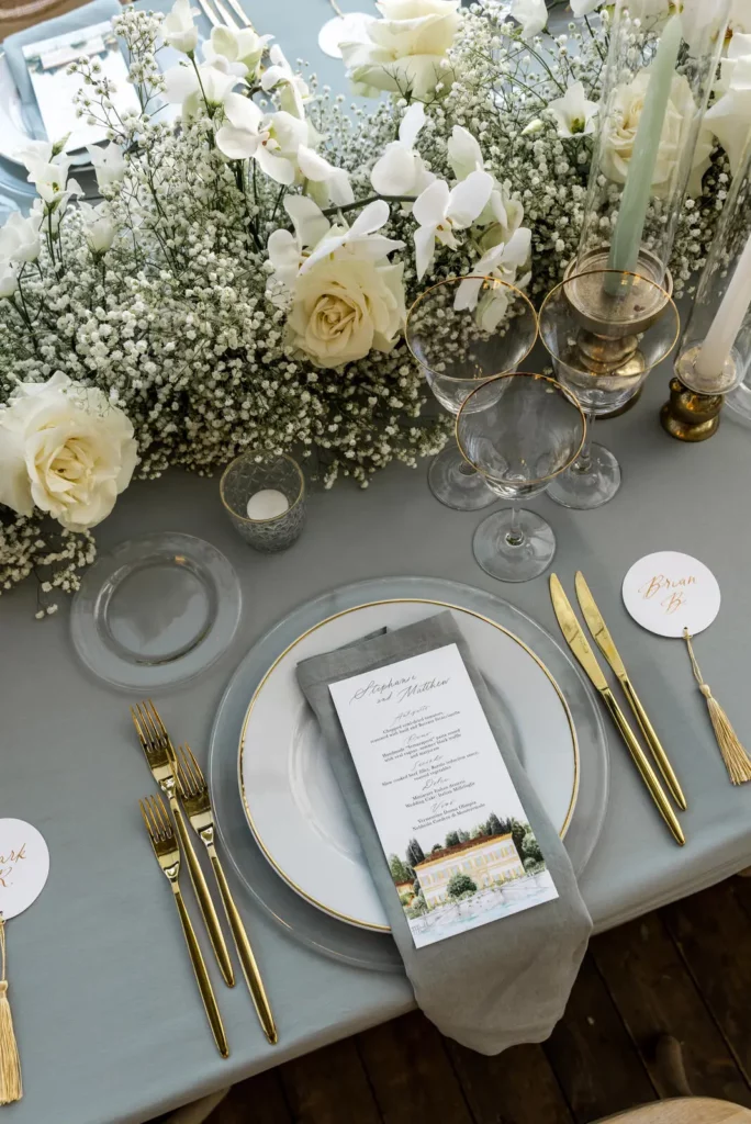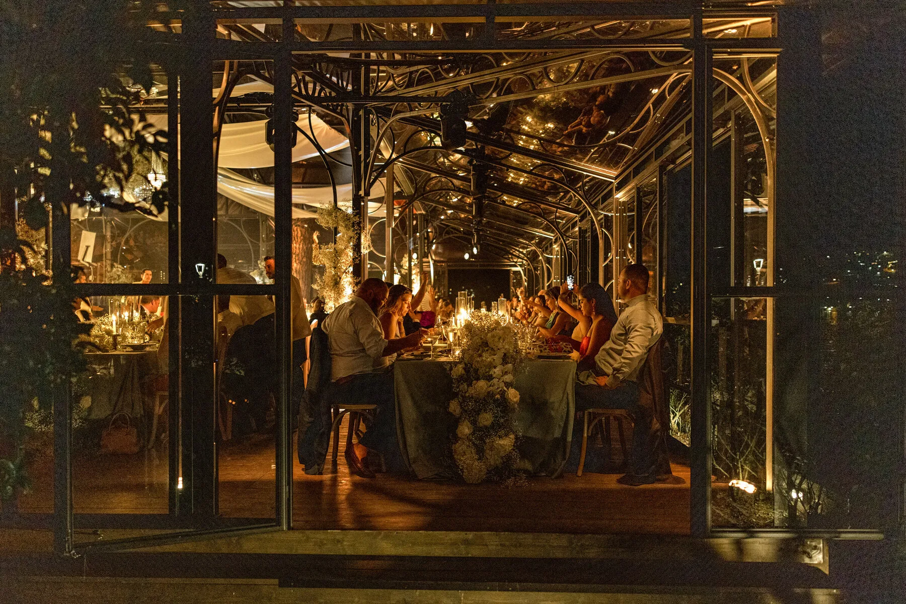 The wedding reception took place in a glass marquee in the villa’s courtyard, combining interiors and exteriors. The exquisitely decorated tent incorporated trees and statues, with green and white colors and touches of gold on the table settings, creating a curated and romantic garden-style reception.