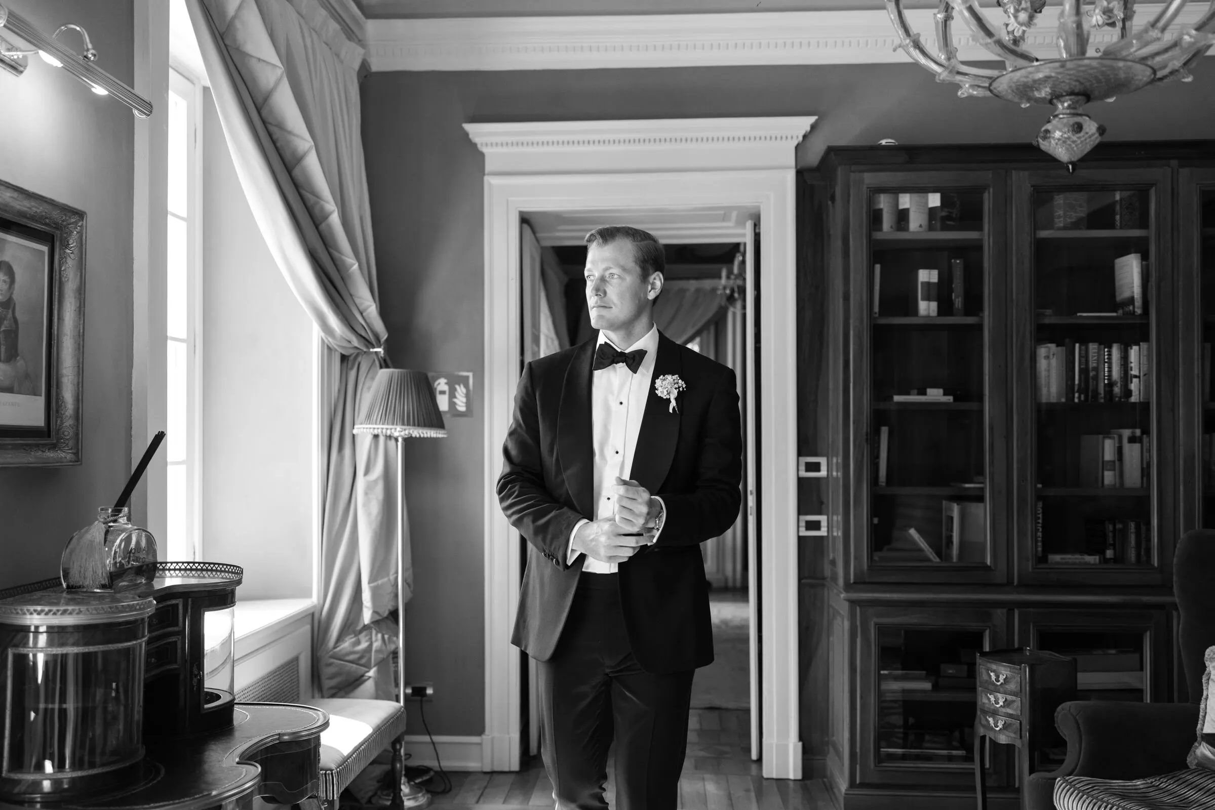Matthew chose a classic black tuxedo from Ralph Lauren, perfectly complementing the wedding theme.