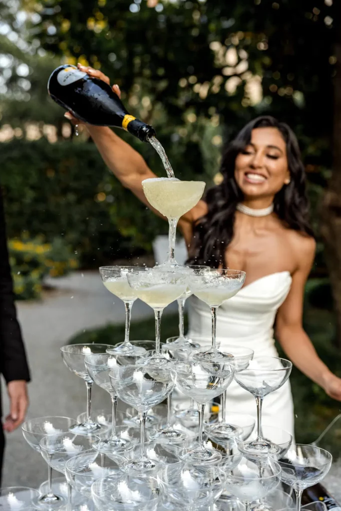 Following the ceremony, guests enjoyed a prosecco toast in the Piazza before venturing on Venetian taxi boats for an impressive arrival at iconic Villa Pizzo. They were welcomed with an Italian aperitivo, golf carts shuttling to a surprise secret photo corner on the rooftop of an old boathouse, one of the best viewpoints in Lake Como, and a champagne tower in the Italian gardens to celebrate the wedding couple.