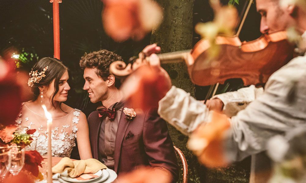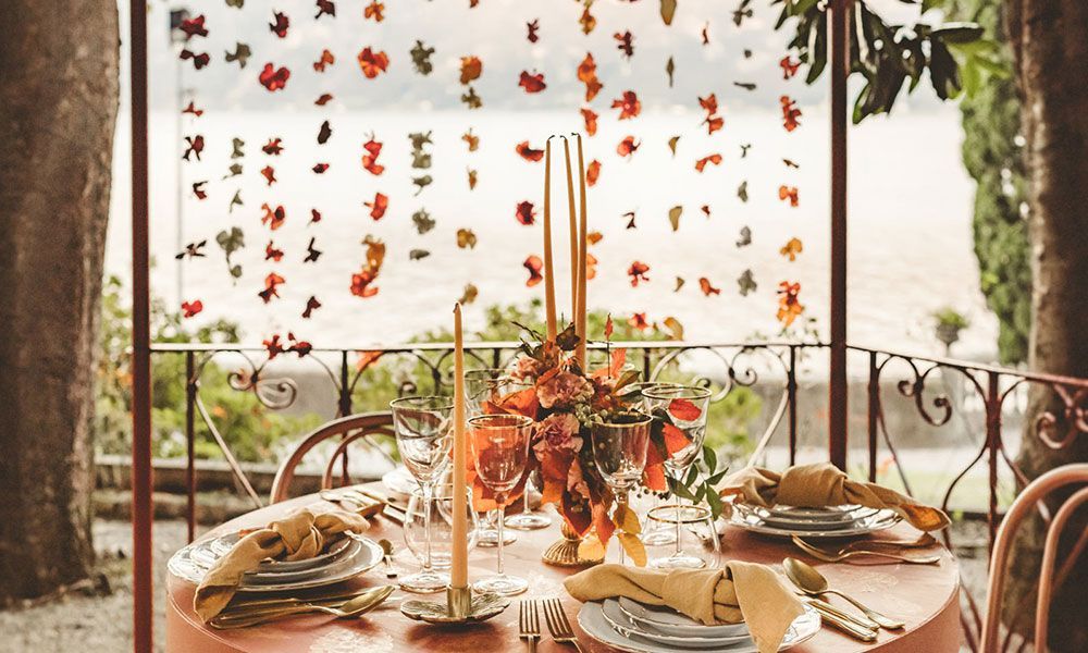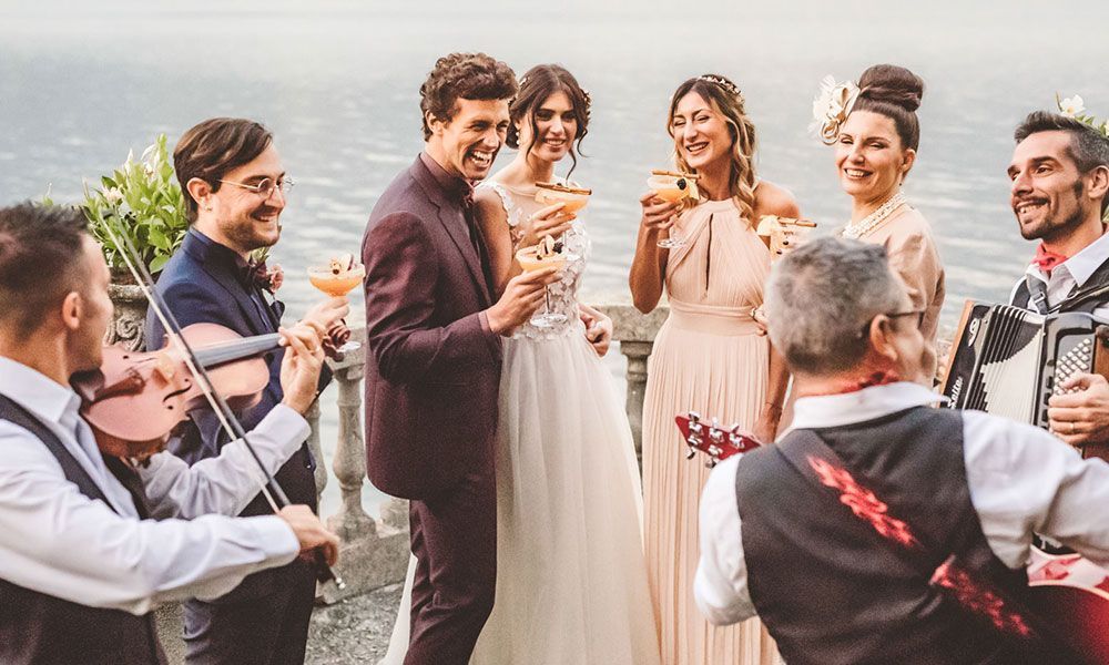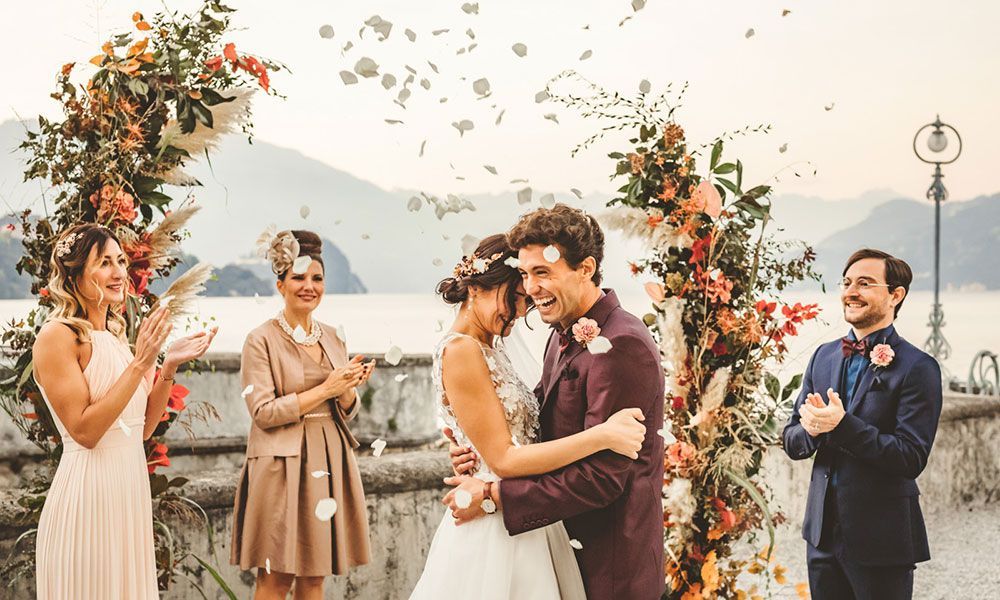 The bride was looking ethereal in a stunning Le Spose di Giò gown along with hair accessory from Tocados Le Touquet, and the groom wore a burgundy dress which is emerging as a trendy color by Area 2 Rezzonico. The ceremony was organized by the lake where the guests enjoyed a joyous violin performance along with classical mocktails.