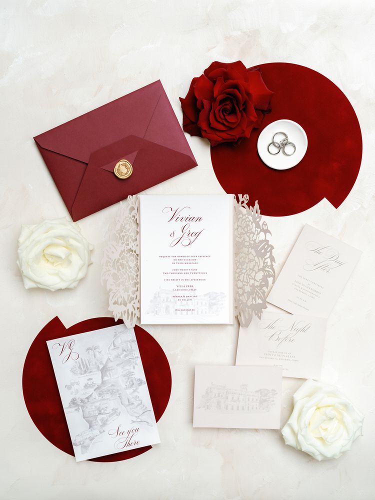 The couple’s stationery suite from Letterlink previewed their party’s red color scheme; red calligraphy was splashed across the central invitation card, as well as on the maps the duo included in each (burgundy) envelope. A gold wax seal completed the look.