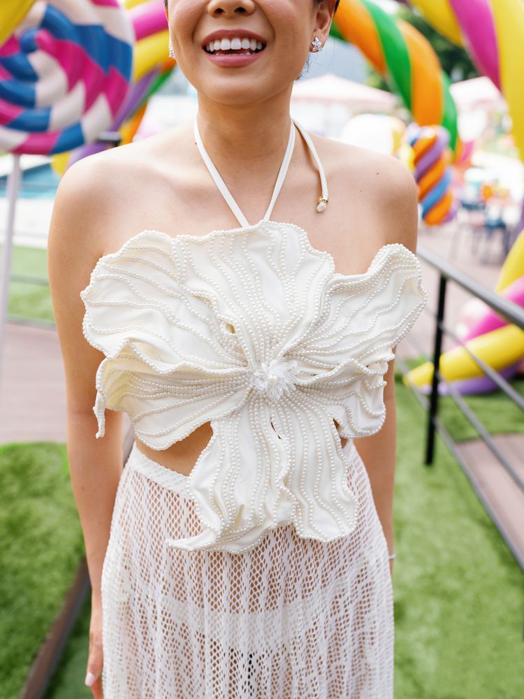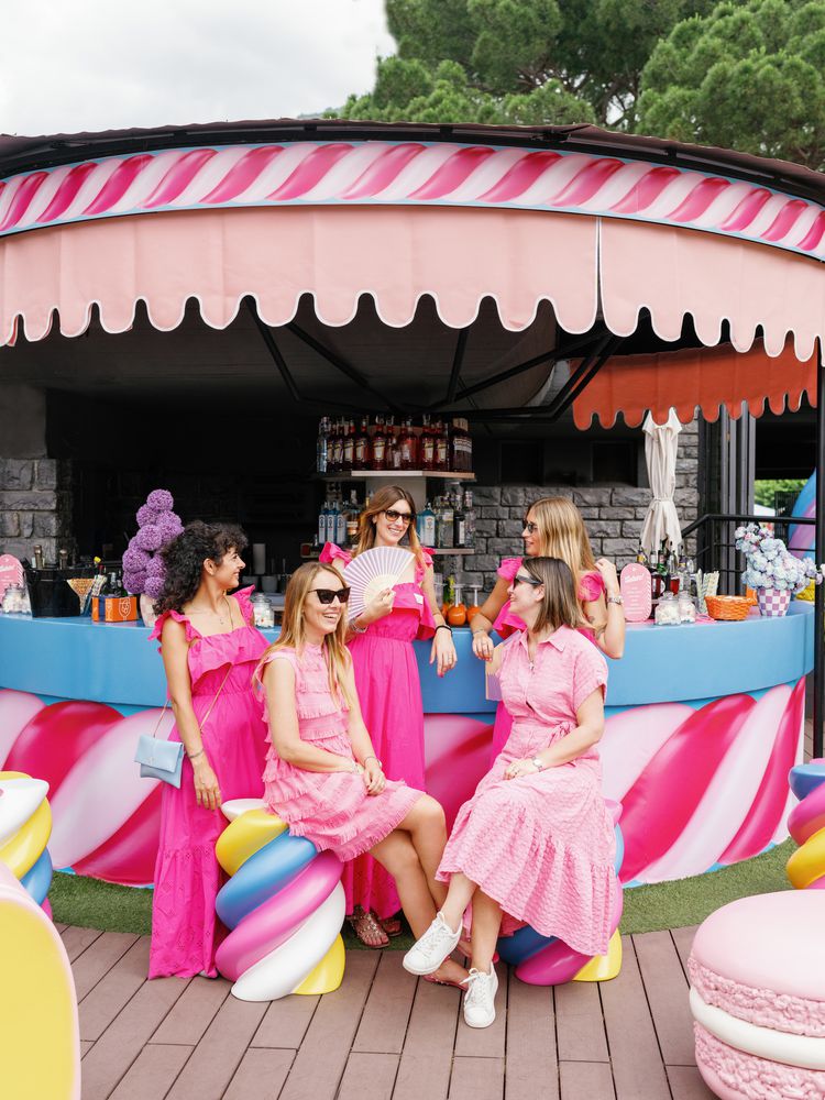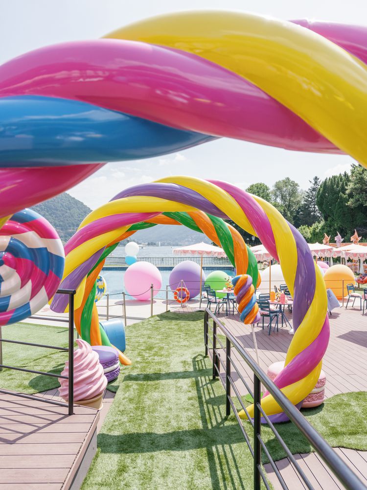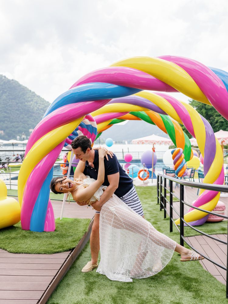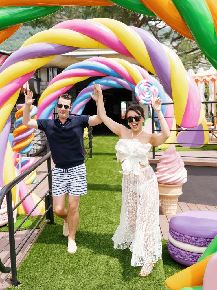 The following day, the celebrants reconvened at Lido di Cernobbio for the duo’s farewell pool party. “Early in the planning phase, after we decided that we wanted to do a farewell event, we settled on the design idea of ‘Sweet Like Candy,’” says the bride, who has a major sweet tooth. “We were going for something out of Willy Wonka or Alice in Wonderland, which we thought would give off a really whimsical and easygoing vibe. When our planners came up with the idea of creating 3D-printed objects to bring the idea to life, we went with it! It could not have turned out any better—we were shocked when we arrived and were transported to our very own Candy Land.”