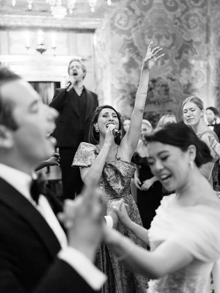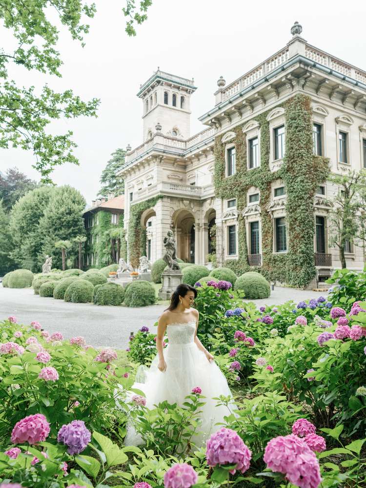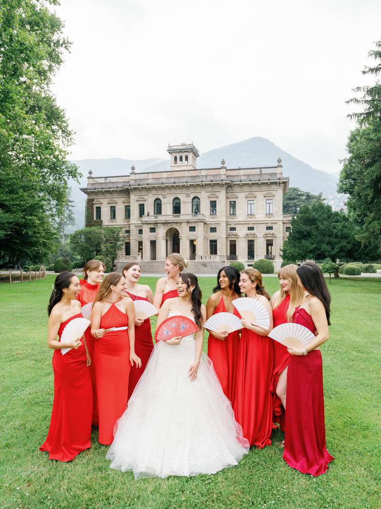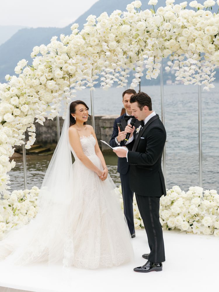 Vivian and Greg ultimately turned to another prominent property on the iconic lake—Villa Erba—for their wedding weekend’s main event. Funnily enough, it wasn’t one they’d seen in person, but they booked it anyway. From afar, they fell in love with the grounds, and when they visited the estate ahead of their nuptials, they realized how grand the interior was. “The main atrium and dining room have soaring ceilings with incredibly beautiful frescoes painted on them, in addition to a really impressive grand staircase leading into the space,” says the bride. “Once we saw it, we knew we’d picked the right venue.”