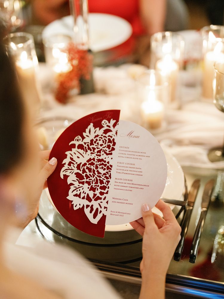 Red laser-cut menus were on-palette and on-theme; the rest of the place settings, including the glassware and linens, were kept simple to keep the focus on the main attraction—the florals, the food, and the entertainment, shares the bride.