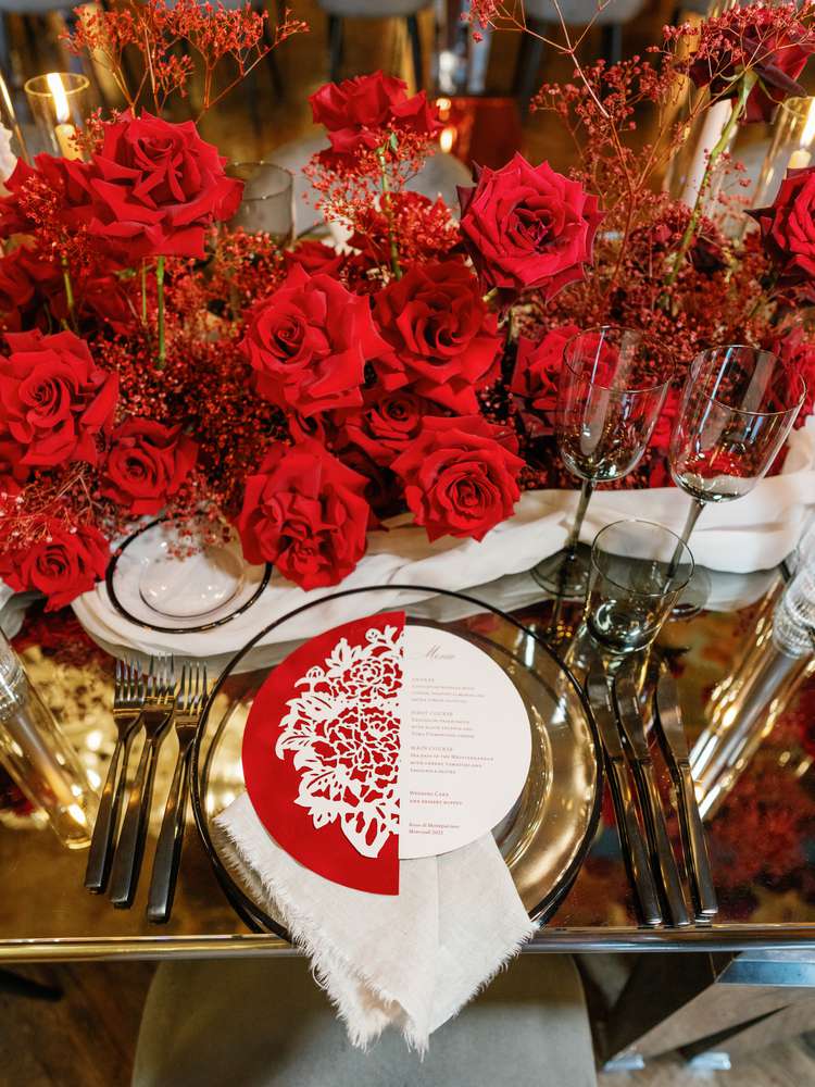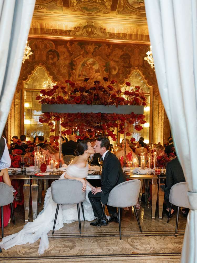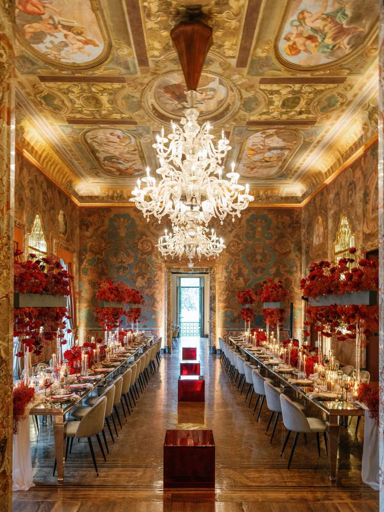 Come the reception, which took place inside one of the villa’s dining rooms with painted frescoes on the ceilings, everything was red. “We chose mirrored tables with runners to reflect the incredible ceilings in the dining room. Large centerpieces were filled with red roses and an assortment of other flowers and greenery,” says Vivian. “They were designed to provide height to the room, without obstructing the chandeliers or the guests seated across the table.”
