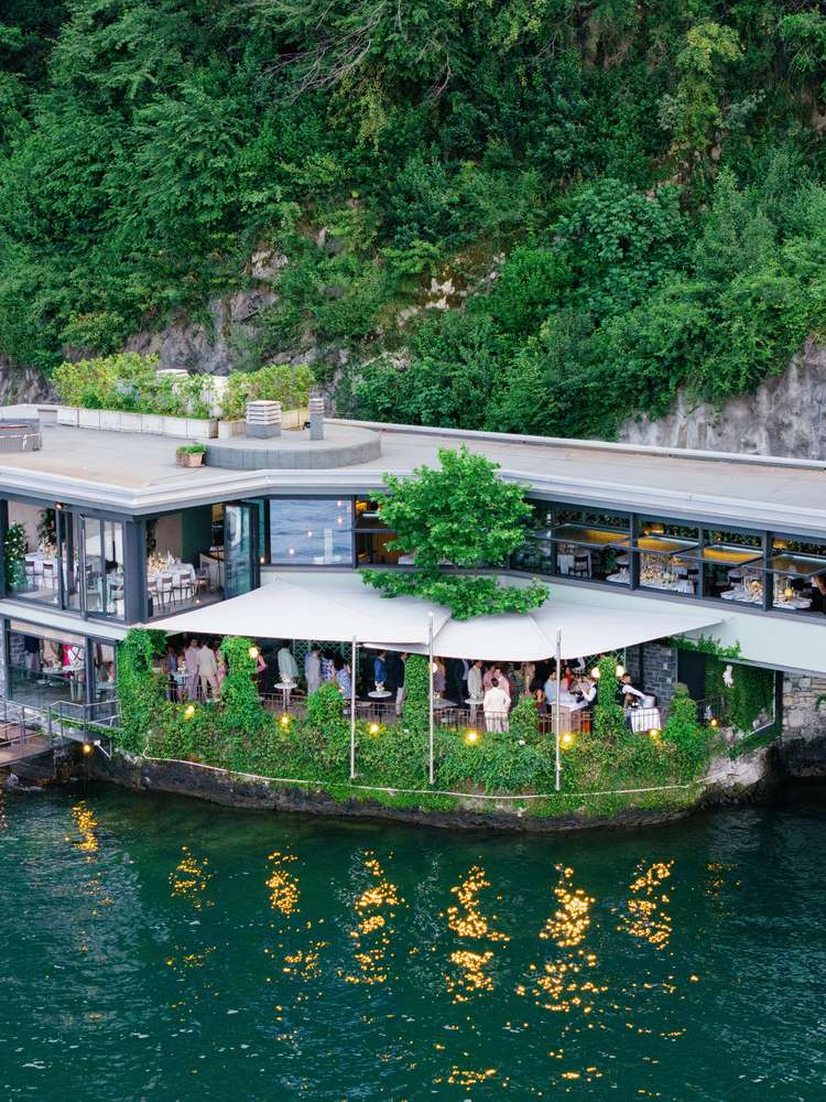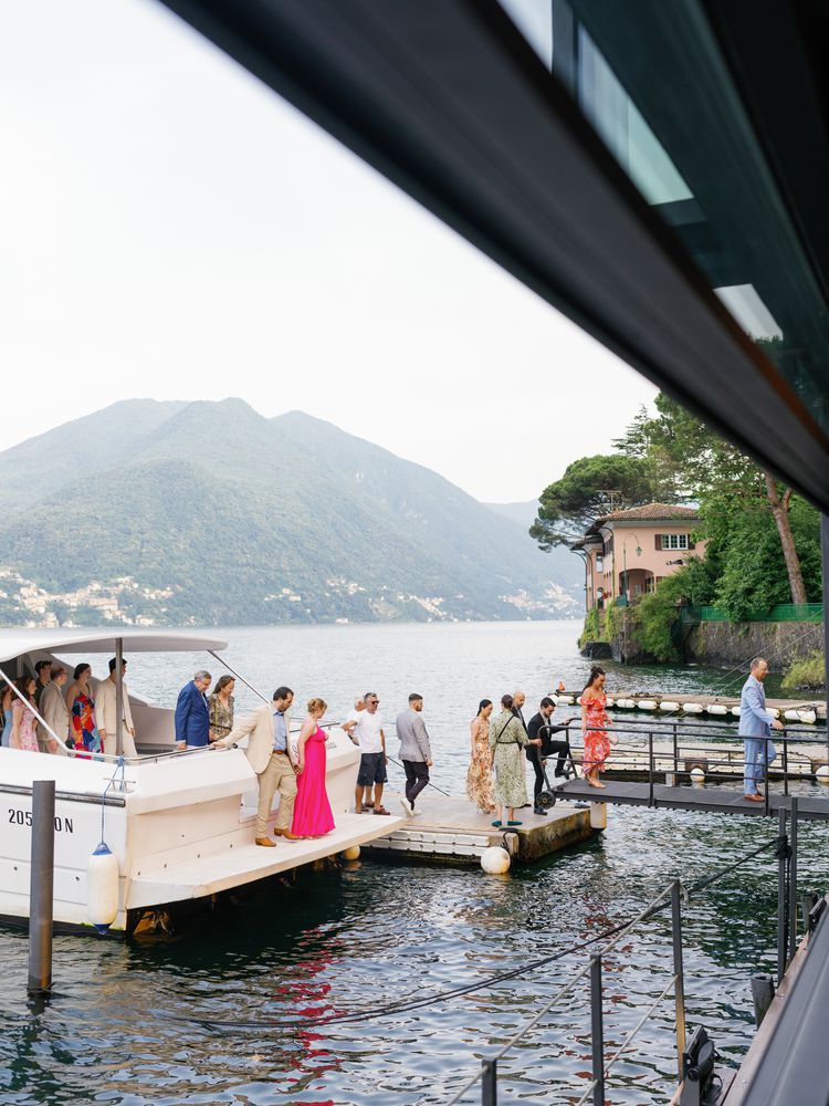 Guests arrived at the welcome party at Ristorante Crotto dei Plattani via a yacht before the couple of honor made their debut in their own boat. “Pulling up knowing that all the important people in our lives had traveled to Italy to celebrate us was an incredible, and overwhelming, feeling,” says Vivian, who wore a floral Zimmerman dress.