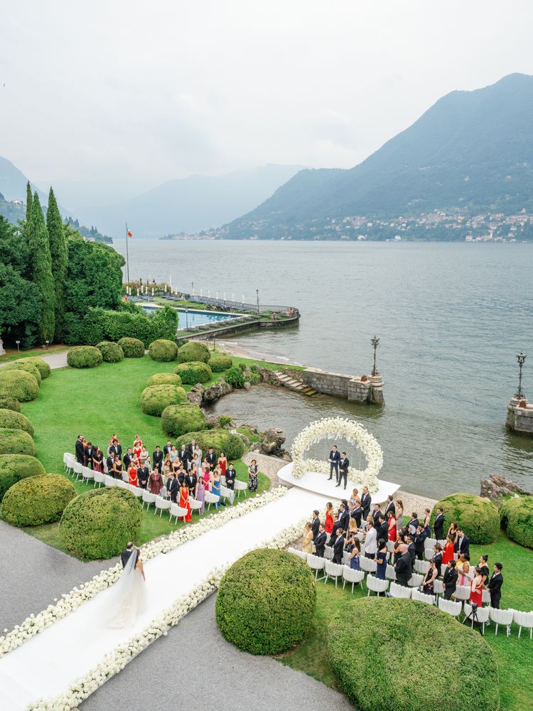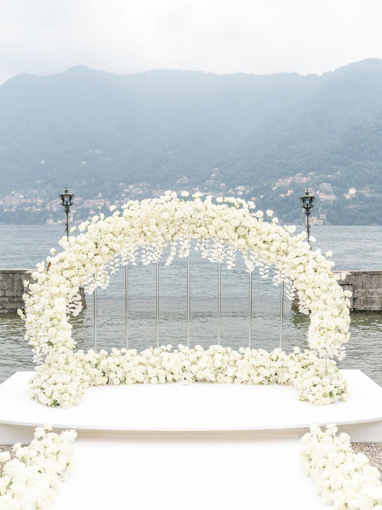 The ceremony took place on the property’s dock, which made the couple look as though they were standing on the lake when they reached the altar. A circular arch by Riccardo Ciceri was constructed on the platform and was designed to provide a direct view for guests out onto the lake with clear acrylic supports in the middle; from a distance, the flowers, a mixture or white roses and orchids, looked like they were floating.
