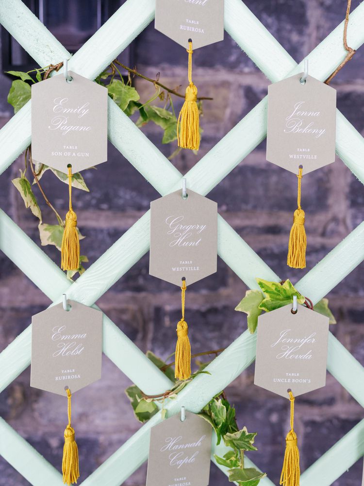 The couple installed custom wooden trellises covered in florals—and in some cases, escort cards—to disguise the property’s walls and threw open the windows on the other side of the space to take advantage of the view; pale blue floral linens, fringed lamps and napkins, and vibrant centerpieces contributed to the at-home vibe. “The feel of the room blew us away when we came upstairs to take our seats,” says the bride.