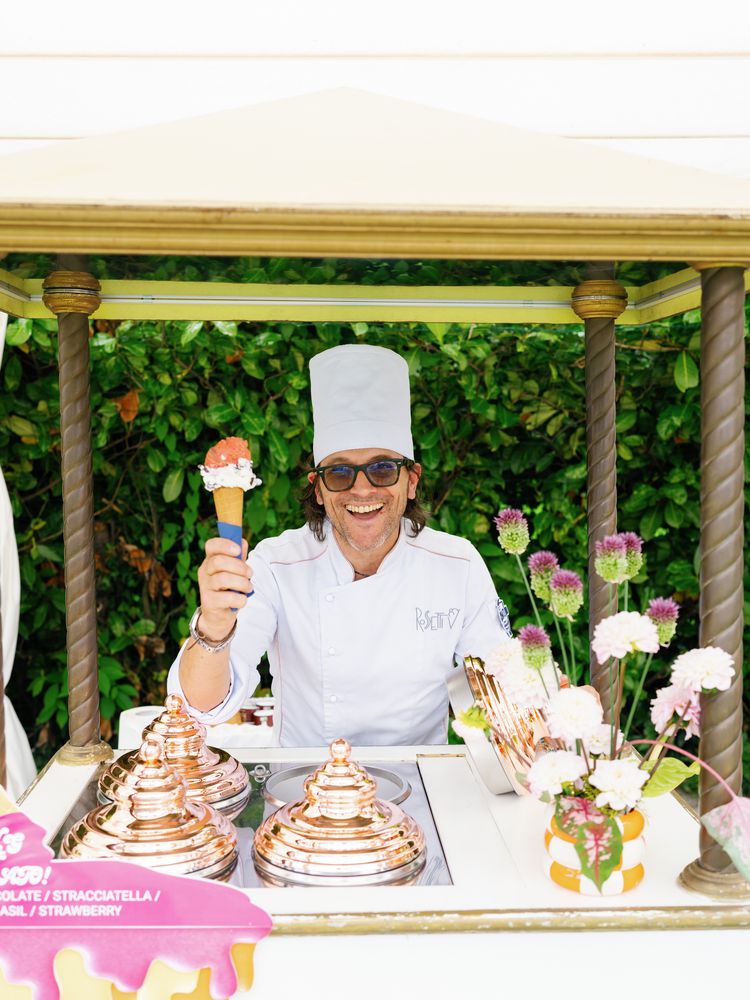 Guests quickly shed their “beach chic” outer layers and hopped into the pool, which was a “welcome reprieve from the heat and a nice way to recover from the previous night’s festivities,” notes the bride. A gelato station also helped keep everyone cool. “One of our earliest memories as a couple is our nightly gelato during our first trip to Positano,” says the bride. “It was a must for us to have a gelato cart during the party, and of course, it had to include our favorite flavor: stracciatella.”